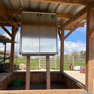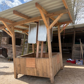 Dit betekent dat de IJslandse paarden vijf keer per dag worden gevoerd. Ik maak het hooi vochtig omdat een van de pony's astma heeft. Alles werkt vlekkeloos en er past ruim 6 kg vochtig hooi in elke timer. Het hooit valt rechtstreeks in de hooiruif.